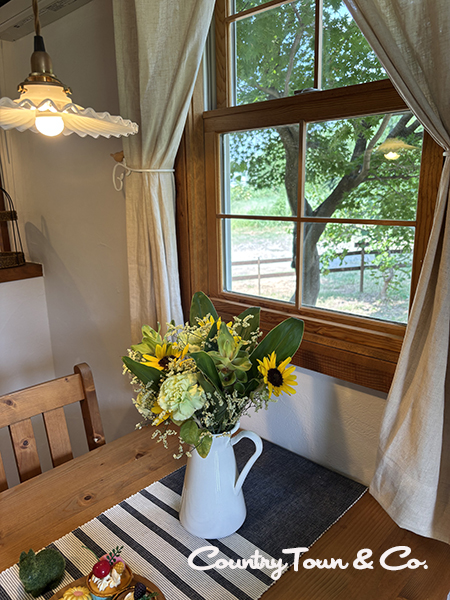 先日、私が趣味で習っているダンスの発表会があったのですが、その時に沢山のお花を頂き、その中からカントリータウンに似合いそうなお花をモデルハウスの中にも飾ってみました。
