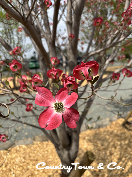 新しく植えられた赤いハナミズキがあり、綺麗な花を咲かせています。